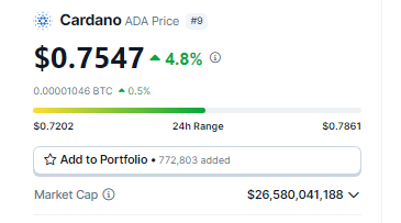 Optimism surrounds Cardano (ADA) regardless of some latest hiccups. ADA stands resilient, sustaining a optimistic outlook regardless of a 5% lower over the previous week. Presently priced at $0.75, ADA demonstrates a sturdy stance with a 24-hour buying and selling quantity of $1.14 billion and a market capitalization of $24 billion.