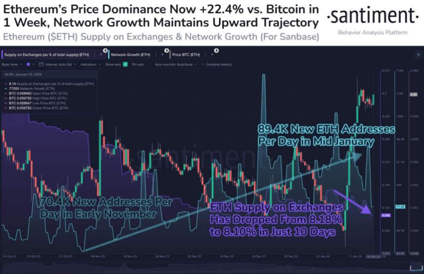 Current information from Santiment vividly illustrates Ethereum’s ascendancy. The platform’s worth dominance, reflecting its market share compared to all different cryptocurrencies, has witnessed a exceptional surge of twenty-two.4% inside a mere week.