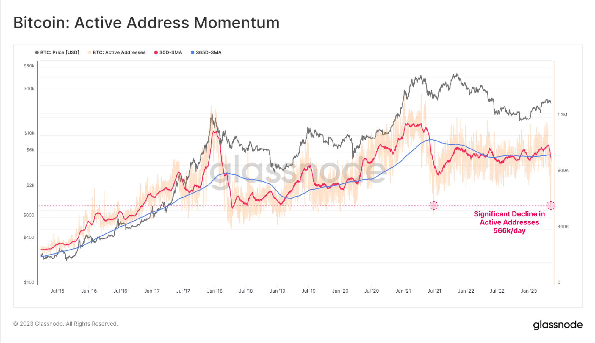 Based on the newest weekly report from Glassnode, the energetic addresses are round cyclical lows of 566,000. The “energetic addresses” metric measures the each day variety of distinctive Bitcoin addresses collaborating in some transaction exercise on the blockchain.
