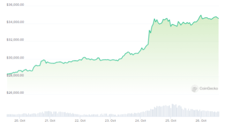 The present Bitcoin value, in response to CoinGecko, stands at $34,750, with a 24-hour rise of two.0% and a formidable seven-day rally of 23.2%.