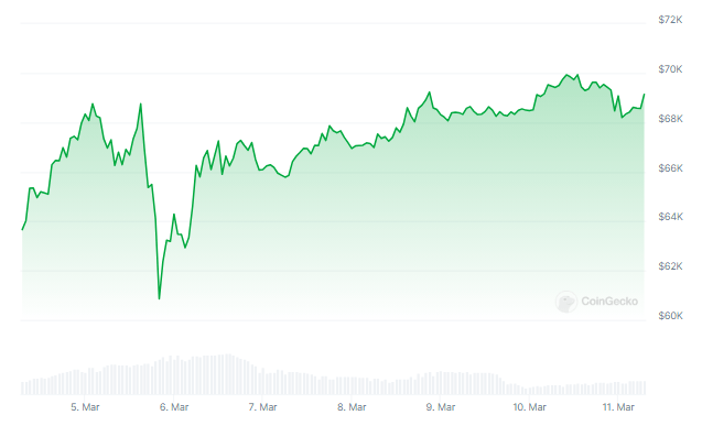 As Bitcoin teeters on the sting of the $70,000 worth vary, the cryptocurrency market is getting ready to a possible breakthrough. On the time of reporting, Bitcoin was buying and selling at about $68,950, marking a ten% improve within the final seven days.
