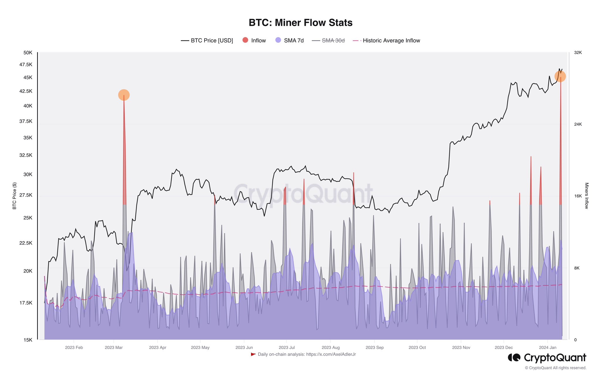 In the meantime, on-chain analyst Axel Adler Jr. could have found a cause for Bitcoin’s lagging efficiency to this point. He identified that “miners have determined to reap the benefits of the money influx into the market.”