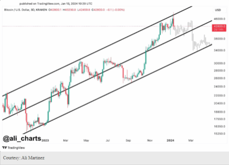 Regardless of the current correction, analysts stay divided on the short-term and long-term prospects for Bitcoin. Ali Martinez, a distinguished crypto analyst, identifies a “parallel channel” sample within the value chart, suggesting a possible retracement to $35,000 earlier than a possible rebound in direction of $50,000.
