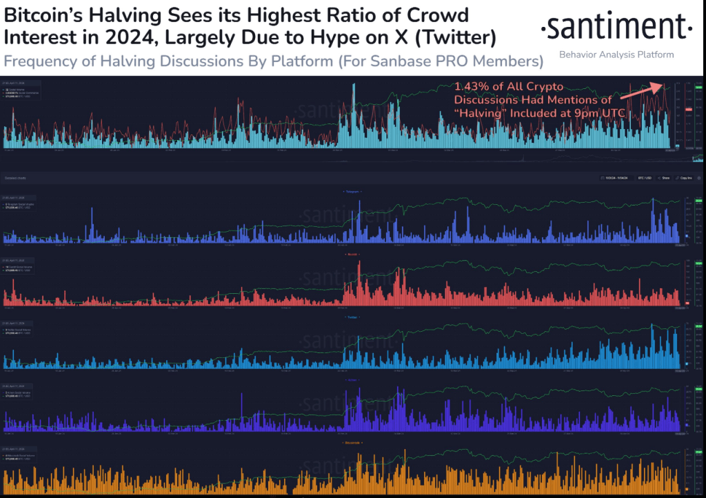 Social media platforms have grow to be abuzz with discussions surrounding the upcoming halving, in accordance with knowledge from Santiment. This improve in social media chatter signifies a possible for vital worth actions within the unstable crypto market, sparking each FOMO (Worry of Lacking Out) and FUD (Worry, Uncertainty, Doubt) amongst buyers.