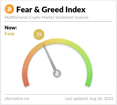 Bitcoin (BTC) is at the moment marked by cautious sentiments because the Crypto Worry and Greed Index holds regular throughout the worry zone, scoring 39 out of 100 and exhibiting a slight improve from the day gone by.